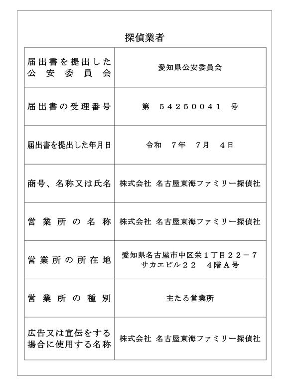名称 | 株式会社 名古屋東海ファミリー探偵社 |